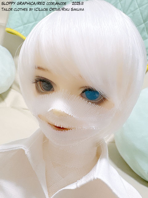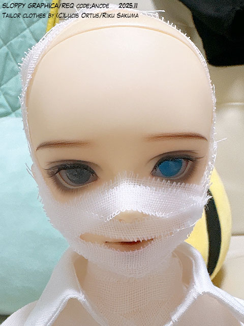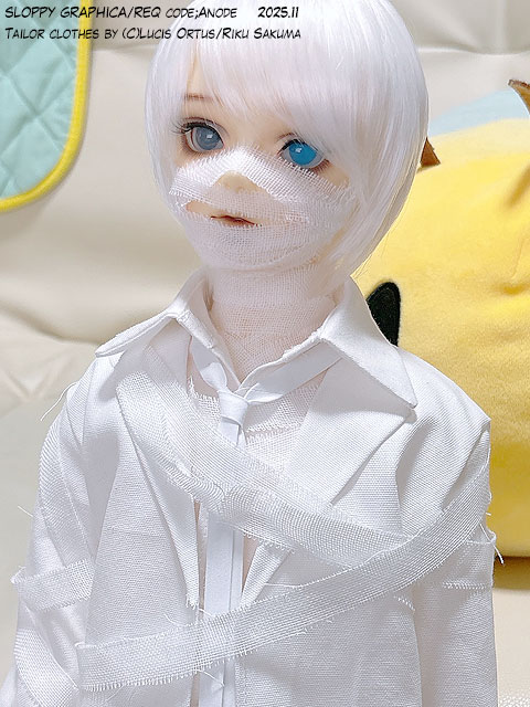 ムービー見て確認したけど顔や首、デコルテにも巻いてる。服着て、その上からも巻いてある。 これは伸縮しないガーゼの包帯を細く切って繋げたもの。